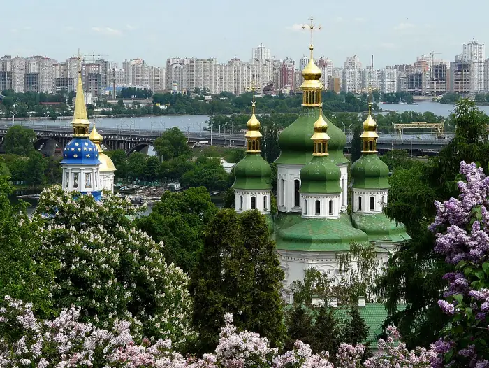 Blick auf Kiew, im Vordergrund Teile des Sankt-Michael-Klosters Widubitsch. Foto: Nick Grapsy