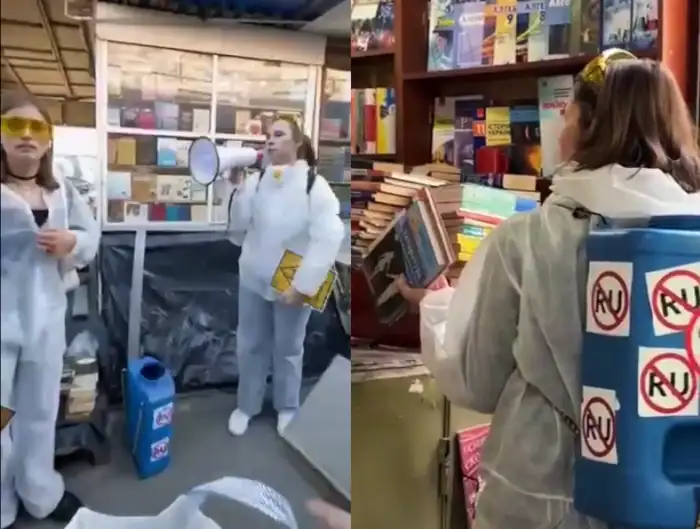 Nationalistinnen terrorisieren in der Ukraine Büchermärkte und deren Kunden. In improvisierte weisse «Schutzanzüge» gekleidet (um sich nicht zu «kontaminieren»), beschlagnahmen sie russischsprachige Bücher und Medien, «versiegeln» sie und führen sie selbstermächtigt dem Recycling zu. Quelle: Alina Lipp, t.me/neuesausrussland