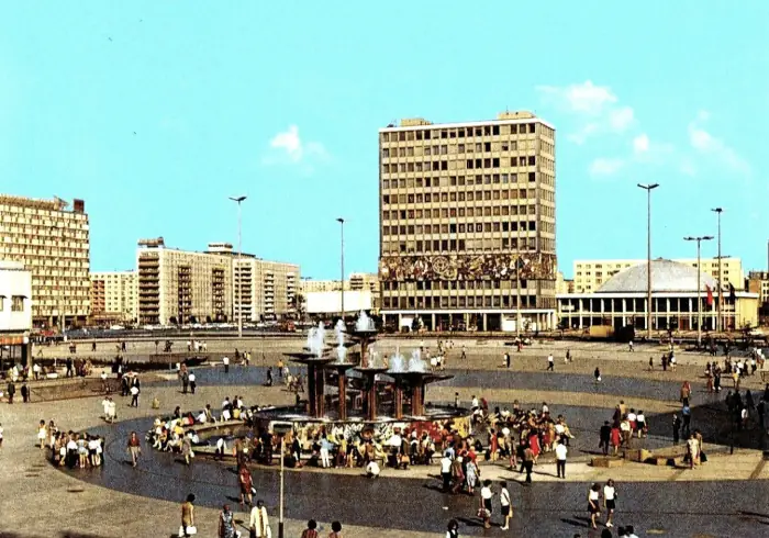 Der Platz wurde nach den Zerstörungen des Zweiten Weltkriegs in der zweiten Hälfte der 60er Jahre mit einem umfassenden städtebaulichen Projekt wiedergeboren, bei dem die neu errichteten modernistischen Gebäude einen großen städtischen Fußgängerbereich umgeben, der in jeder Hinsicht ein sozialistischer Platz ist, der stolz eine beträchtliche Anzahl von Menschen, sogar mehrere Tausend, beherbergen kann, wie während des 10. Weltjugendfestivals im Sommer 1973.
