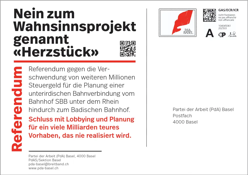 Die Partei der Arbeit Basel (PdA) hat beschlossen, gegen einen Dreieinhalb-Millionen-Planungskredit, der vom Grossen Rat ohne Befragung der Basler Stimmürger verabschiedet wurde, das Referendum zu ergreifen. Es geht um das Projekt für eine unterirdische, unter dem Rhein durchführende Bahnverbindung zwischen den beiden grossen Basler Bahnhöfen. Die PdA Basel erachtet dies als Geldverschwendung, da eine Realisierung des Projekts höchst unwahrscheinlich ist und mit einer oberirdischen Lösung für einen Bruchteil der Kosten betrieblich sogar ein besserer Effekt (Ringschluss des Basler S-Bahn-Netzes, Anschlusslinie zum Flughafen) erzielt werden kann. … mehr