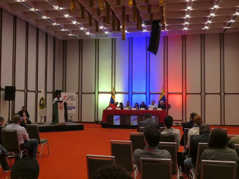 Heute Samstag fand der offizielle Festakt der 2. Internationalen Solidaritätsmission mit Venezuela des Weltbundes der Demokratischen Jugend und des Weltfriedensrates statt. 87 Delegierte von 65 Organisationen aus 45 Ländern, darunter Argentinien, Bangladesch, Brasilien, Deutschland, Frankreich, Griechenland, Indien, Italien, Kanada, Korea, Kuba, Mexiko, Nepal, Österreich, Palästina, Peru, Portugal, Russland, Schweiz, Spanien, Sri Lanka, Südafrika, Syrien, Tschechische Republik, Tunesien, Westsahara, USA und Zypern, kamen nach Caracas, um dem venezolanischen Volk ihre Solidarität auszudrücken. In ihren Erklärungen verurteilten die Delegierten die anhaltenden politischen, wirtschaftlichen und medialen Angriffe und die Finanz- und Wirtschaftsblockade der US-Regierung, ihrer europäischen Alliierten und der rechten Regierungen Lateinamerikas gegen Venezuela. Diese verstossen mit den Angriffen gegen die Charta der Vereinten Nationen und das Völkerrecht.