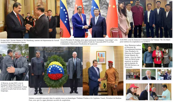 Fotos: Im Juni 2025 begrüsst Nicolás Maduro Wu Hansheng von der Abteilung für gesellschaftliche Arbeit der Kommunistischen Partei Chinas. Bei seinem fünften Besuch in China (2023) konnte der bolivarische Präsident eine strategische Allwetter-Partnerschaft mit Präsident Xi Jinping unterzeichnen und die Zusammenarbeit zwischen der Vereinigten Sozialistischen Partei Venezuelas (PSUV) und der Kommunistischen Partei Chinas mit dem Ziel der Armutsbekämpfung verstärken. Im April 2025 traf sich Maduro mit der Kommunistischen Jugend Vietnams, um die Zusammenarbeit erneut zu verstärken. Im Mai 2025, anlässlich des 80. Jahrestages des Sieges über den Nazifaschismus, traf er in Moskau den kubanischen Präsidenten Díaz-Canel: Der PSUV und die Kommunistische Partei Kubas arbeiten seit langer Zeit auf höchster Ebene zusammen. Ebenso traf Maduro seine Amtskollegen Wladimir Putin und Hauptmann Traoré, Präsident von Burkina-Faso, mit denen er mehrere Kooperationsabkommen unterzeichnete.