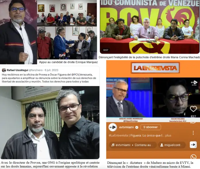 Fotos: Oscar Figuera, der «Kommunist», in Aktion. Er unterstützt den rechten Kandidaten Enrique Márquez bei den Präsidentschaftswahlen 2024. Er protestiert gegen die Nichtwählbarkeit der rechtsextremen Putschistin María Corina Machado – einer Oligarchin, Kandidatin des Likud und Washingtons, die Netanjahu in einem Brief aufforderte, militärisch gegen Maduro vorzugehen. Er verurteilt Maduros «diktatorische Praktiken» gemeinsam mit dem Direktor von Provea, einer ursprünglich unpolitischen und auf Menschenrechte fokussierten NGO, die sich heute aber offen gegen die Revolution stellt. Oder er verurteilt Maduros «Diktatur» live auf EVTV, dem in Miami ansässigen Fernsehsender der extremen Rechten Venezuelas.