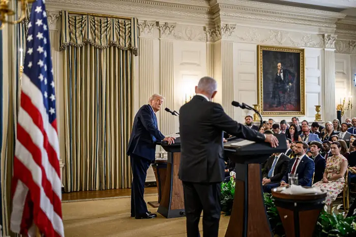 US-Präsident Donald Trump und der israelische Ministerpräsident Benjamin Netanjahu geben am 29. September 2025 im Weissen Haus eine gemeinsame Pressekonferenz, auf der sie den sogenannten US-Friedensplan für Gaza vorstellen. (Offizielles Foto des Weissen Hauses von Daniel Torok)